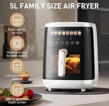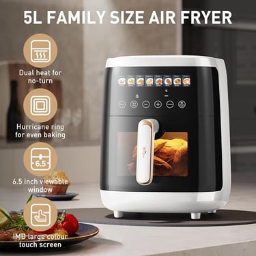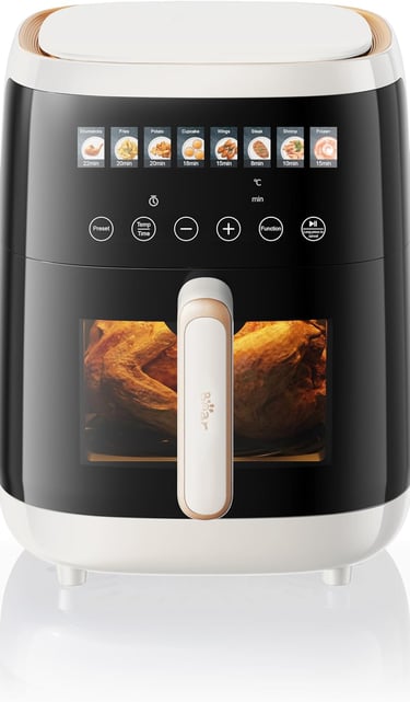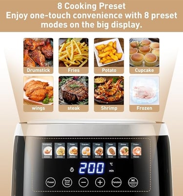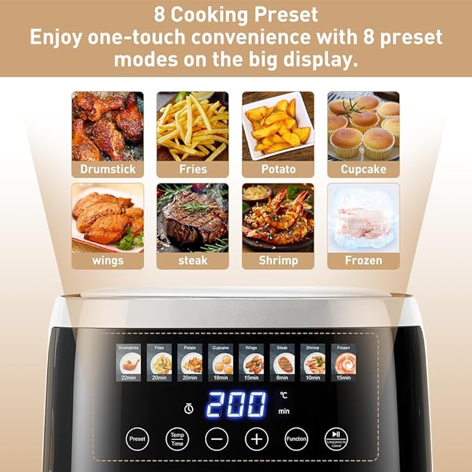 Enjoy one-touch convenience with 8 preset modes on the big display. Customize your recipes with intuitive digital control, adjustable time, and temperature. Don't worry to mess up the food, "shake reminder "ensures evenly cooked, crispy results